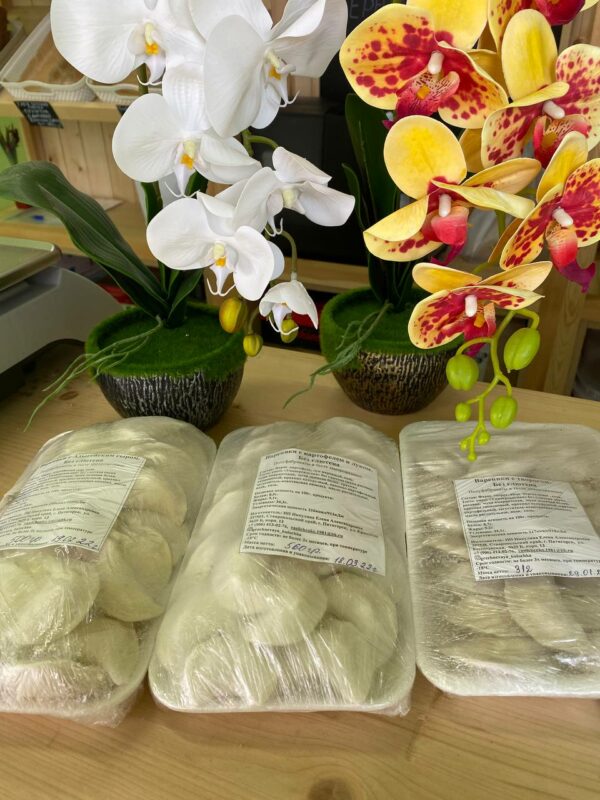 Тесто: Смесь «Мука универсальная без глютена»: мука рисовая, крахмал тапиоковый, кукурузный, мука амарантовая, мука льняная(белая), соль, масло растительное рафинированное, вода. Фарш: картошка, лук, масло растительное рафинированное, соль.